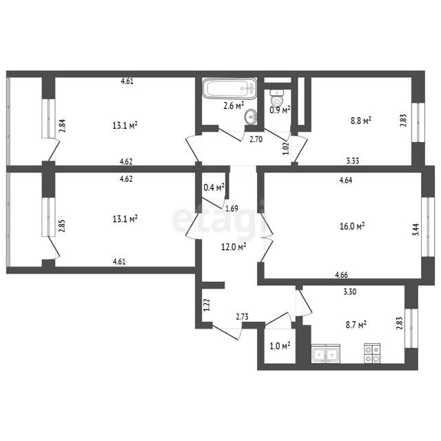 с большой кухней 8,8м и 4 раздельными комнатами, 2мя лоджиями и кладовой ( есть выводы воды – можно сделать еще один санузел)